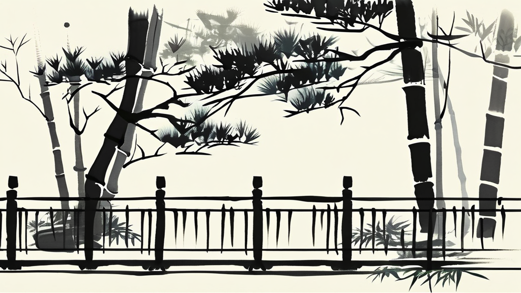 竹林稀疏,透过间隙可见静谧的栏杆。松树茂密,枝叶交错,在祭坛上投下斑驳的阴影。