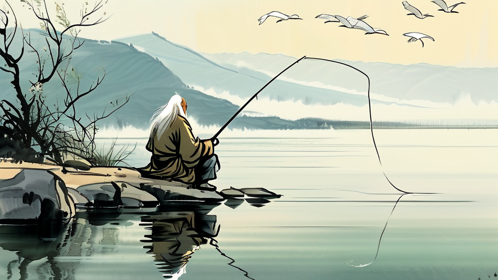 苍茫云海间,一位白发老者独坐渭水之畔。他手持鱼竿,鱼线笔直垂入清澈的溪流,却不见鱼钩。溪水潺潺,倒映着他平静如古井的面容。远处山峦如黛,一群白鹭掠过水面。忽然,一阵清风拂过,吹动老者宽大的衣袍,也吹皱了水面上的倒影。这不同寻常的垂钓之姿,恰似在静候着命中注定的相遇。