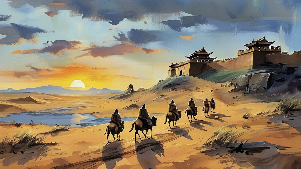夕阳西下,苍茫的戈壁滩上,一队疲惫的商旅正缓缓前行。远处玉门关的城堞在暮色中若隐若现,风沙中隐约传来凄凉的羌笛声。那笛声呜咽,仿佛在诉说着对故乡杨柳依依的思念,却又被这无情的边关所阻隔。春风年年吹绿中原大地,却始终吹不到这座孤寂的关隘。商旅中有人抬头望了望紧闭的关门,眼中闪过一丝落寞,继续低头赶路。