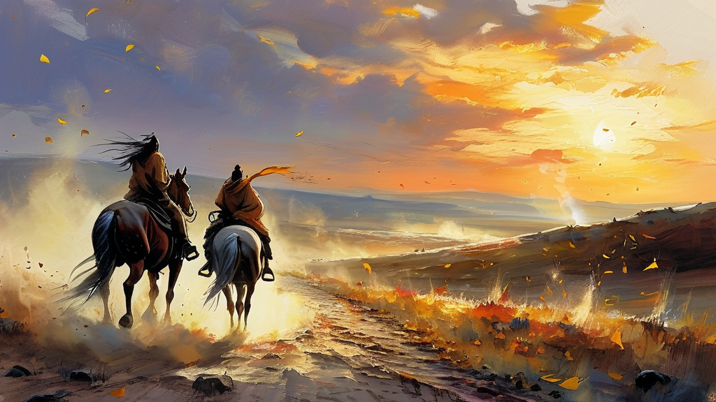 夕阳西下,古道边扬起一片尘土。两个身影在暮色中相对而立,一人翻身上马,另一人挥手作别。马儿似乎也感受到了离别的哀愁,发出阵阵萧瑟的嘶鸣声。马蹄声渐远,只余下风中飘散的黄叶和远处模糊的背影。
