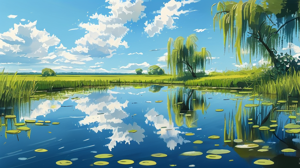半亩大小的方形池塘平静如镜,清澈的水面完美倒映着天空。湛蓝的天色和游走的云朵在水中清晰可见,云影随着微风在水面上轻轻晃动,仿佛在与自己的倒影共舞。池塘周围绿草如茵,几株垂柳的枝条轻拂水面,激起细微的涟漪。整个画面宁静而灵动,天地在这一泓清水中和谐交融。