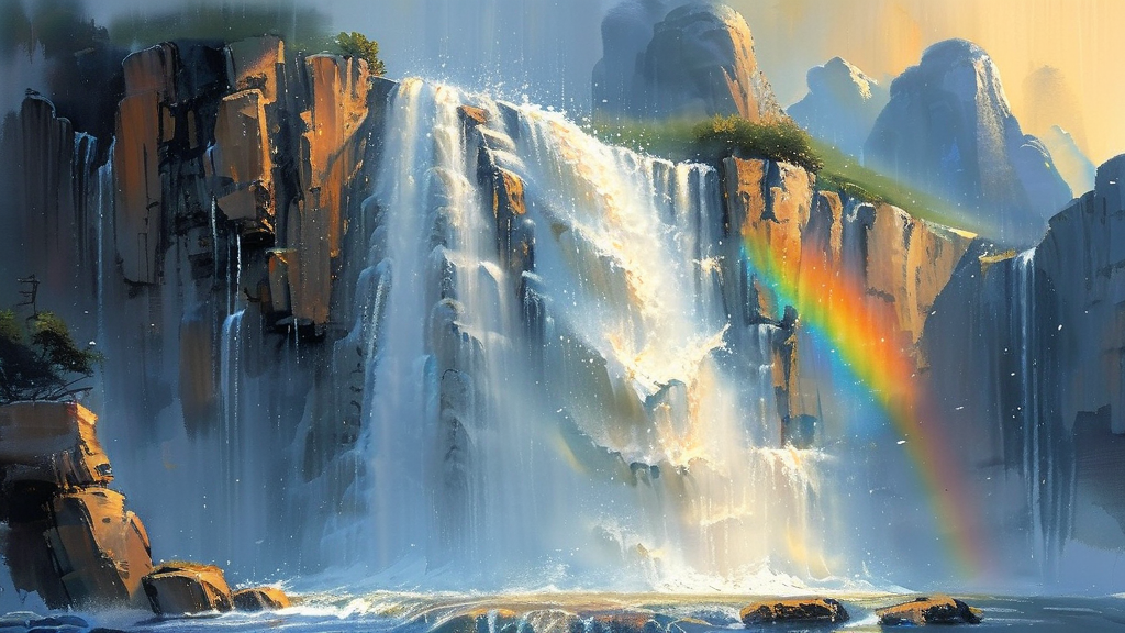 飞瀑如练,自悬崖倾泻而下,在风中飞珠溅玉。千尺白练悬空,水雾弥漫,宛如银河倒悬,自九天倾泻人间。阳光穿透水雾,折射出七彩虹光,与奔涌的瀑布相映成趣。水声轰鸣,如雷贯耳,震撼山谷。