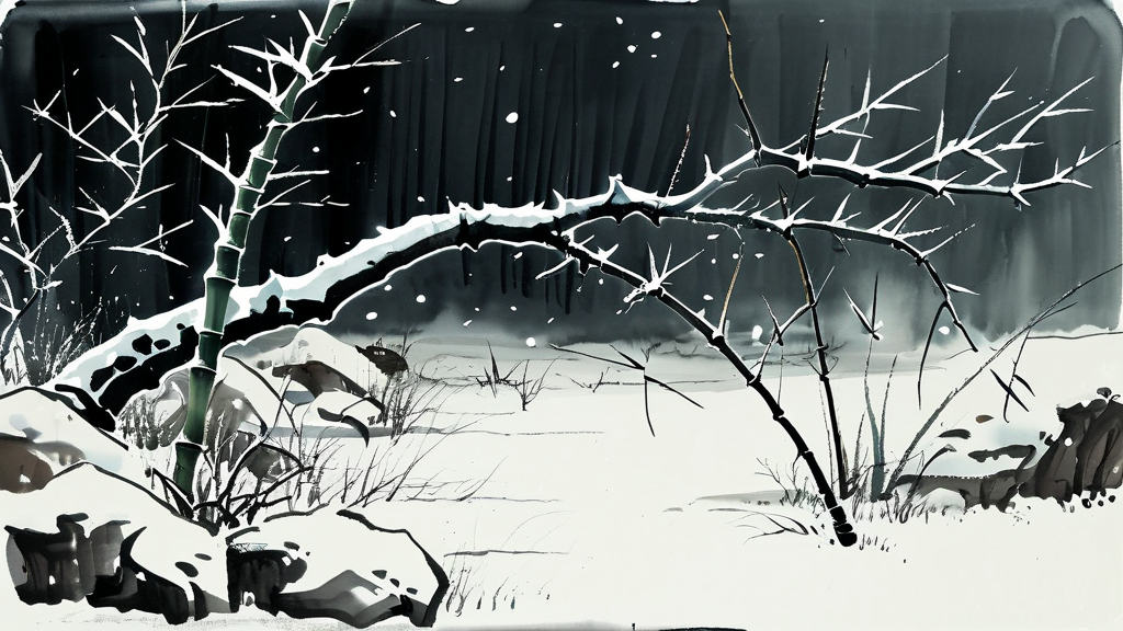 漆黑的夜色中,积雪压弯了枝丫。偶尔传来"咔嚓"一声脆响,那是竹枝不堪重负而折断的声音。万籁俱寂中,这细微的声响格外清晰,仿佛在诉说着冬夜的寒冷与沉重。