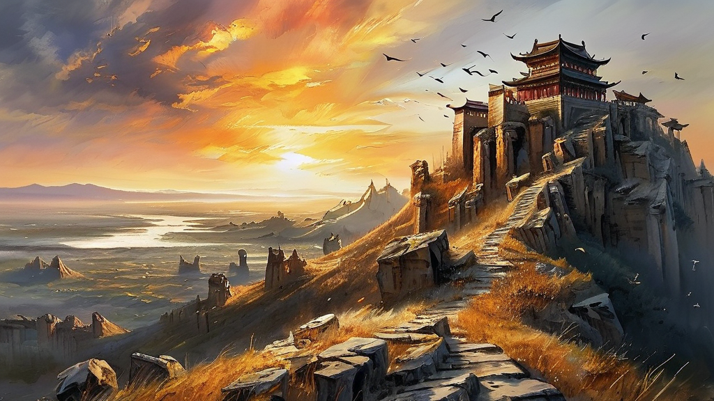 夕阳西下,秋风萧瑟。我独自站在骊山顶上环顾四周,只见满目荒凉。当年阿房宫的冲天大火似乎还在眼前燃烧,那绵延三百里的奢华宫殿群,如今只剩下断壁残垣掩映在荒草丛中。华丽的亭台楼阁早已化为焦土,昔日歌舞升平的景象也随风飘散。几只乌鸦在废墟上盘旋,发出凄厉的叫声。远处渭水依旧静静流淌,见证着这盛衰无常的变迁。