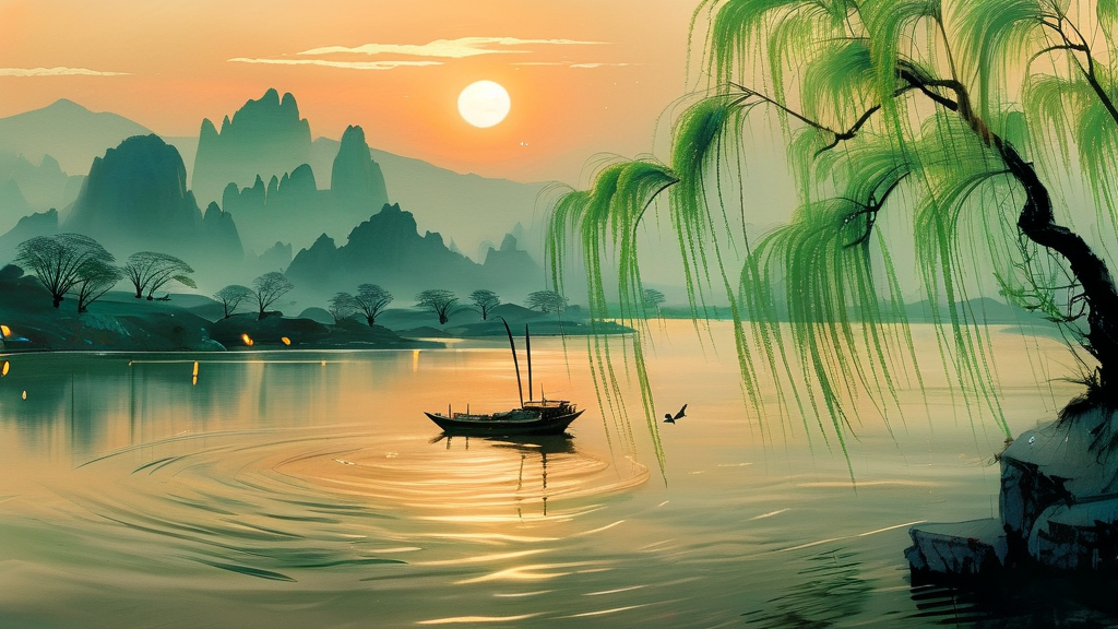 江南的春风吹过,两岸的垂柳嫩芽初绽,新绿如烟。河水在暖风中泛起粼粼波光,几只白鹭掠过水面,惊起一圈涟漪。远处青山如黛,笼罩在薄雾中,隐约可见几株早开的桃花点缀其间。夜幕降临,一轮明月悄然升起,清辉洒在江面上,碎成万千银鳞。孤舟停泊岸边,船头立着个青衫身影,望着明月出神,衣袖在夜风中轻轻飘动。