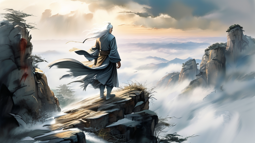一位白发道人孤身立于山巅,衣袂在风中猎猎作响。他眺望远方,目光穿透云雾,似在追寻什么。山脚下,一对年轻男女十指相扣,正艰难攀爬着险峻的山路。女子裙裾被荆棘划破,男子背上伤痕累累,却仍相视而笑。更远处,一个书生模样的人站在悬崖边,手中攥着褪色的香囊,眼中含泪却带着释然。
