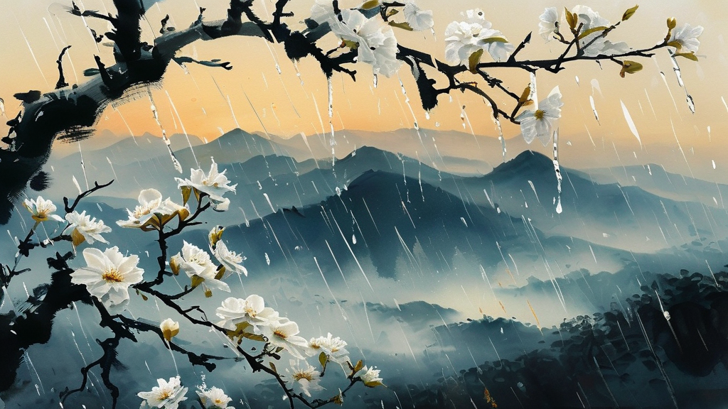 暮色渐浓,远处的山峦在薄雾中若隐若现。微风裹挟着细雨,轻轻拂过林间,搅动着斑驳的树影。洁白的梨花在风雨中摇曳,花瓣零落,仿佛难以挽留这最后的春意。