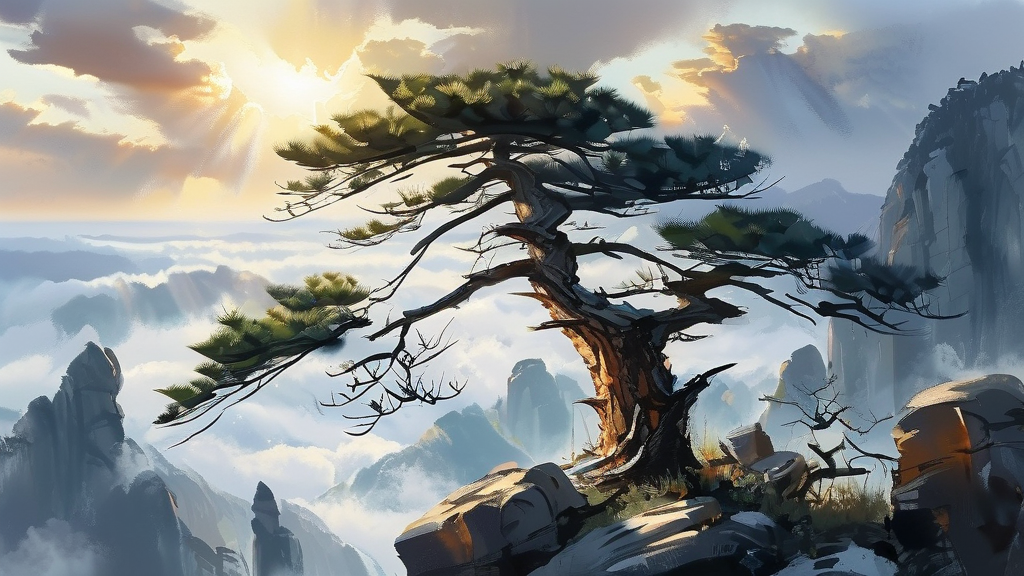 山巅古松傲然挺立,苍劲的枝干刺破云霄。松涛阵阵,清越的声响穿透云层,在山谷间久久回荡。这悠远的声音并非借助秋风之力,而是源自松树本身的高洁品格与挺拔身姿。阳光透过松针洒落斑驳光影,更衬托出这遗世独立的孤高风骨。