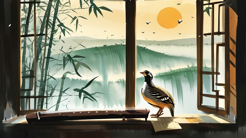 午后的阳光慵懒地洒在南窗下,案头的琴书半开,墨迹未干。一阵倦意袭来,我倚在窗边假寐。忽然,窗外传来几声清亮的鹧鸪啼叫,"咕咕——咕咕——",那声音穿透纱窗,惊醒了浅浅的睡意。睁开眼,只见窗外竹影婆娑,一只鹧鸪正立在枝头,黑白色的羽衣在风中轻轻颤动。它又啼叫两声,振翅飞向远处的青山,只留下几片竹叶在窗前轻轻摇晃。
