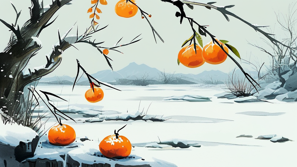 凛冬的残雪积压在枯枝上,几个金黄的桔子倔强地挂在枝头,在纯白的世界里格外醒目。远处传来沉闷的春雷,冻土之下,嫩笋被惊醒,正积蓄力量准备破土而出,那尖尖的笋芽已隐约可见。