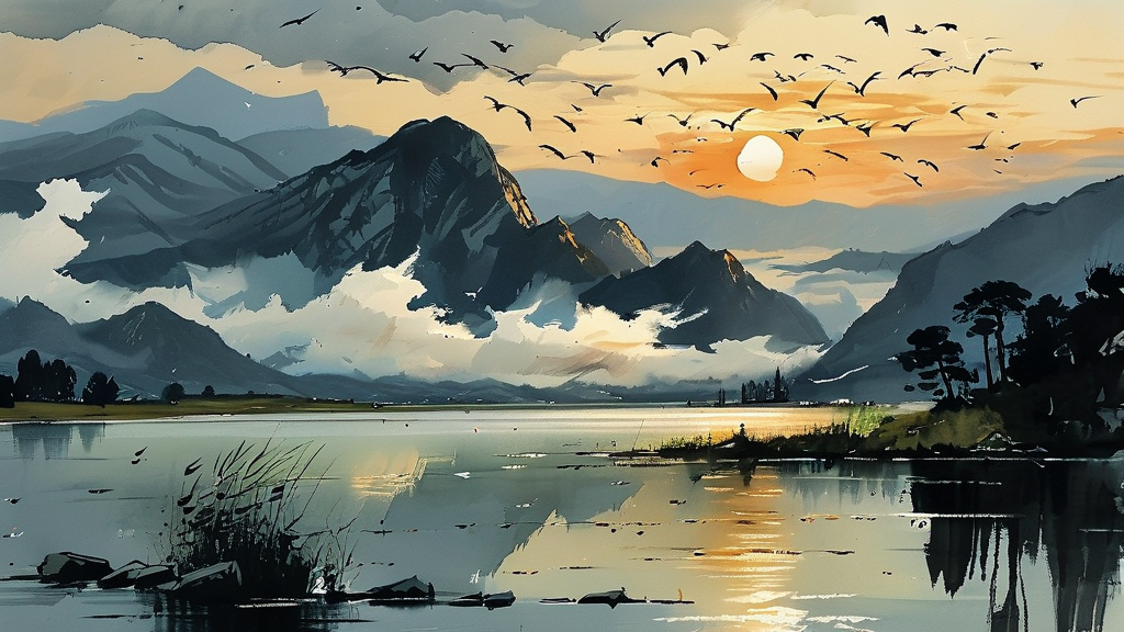群山环抱的湖面,暮色渐浓。最后一群飞鸟掠过天际,消失在远方的暮霭中。湖心倒映着孤零零的一朵白云,正缓缓飘向山谷深处。微风拂过水面,荡起细碎的波纹,更显出天地间的空旷与寂静。