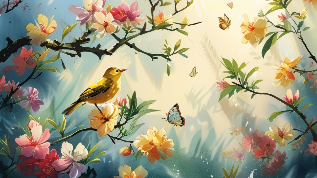 春风轻拂,花丛间彩蝶翩翩起舞,时而停驻花蕊,时而在空中嬉戏追逐。阳光透过枝叶洒下斑驳光影,一只黄莺站在嫩绿的枝头,抖动着金黄的羽毛,发出清脆悦耳的啼鸣。远处传来此起彼伏的鸟叫声,与近处莺啼交织成欢快的乐章。蝴蝶的翅膀在阳光下折射出梦幻般的光彩,与满园盛开的花朵相映成趣。